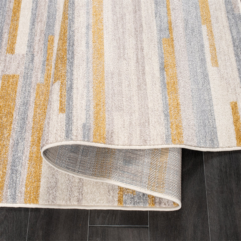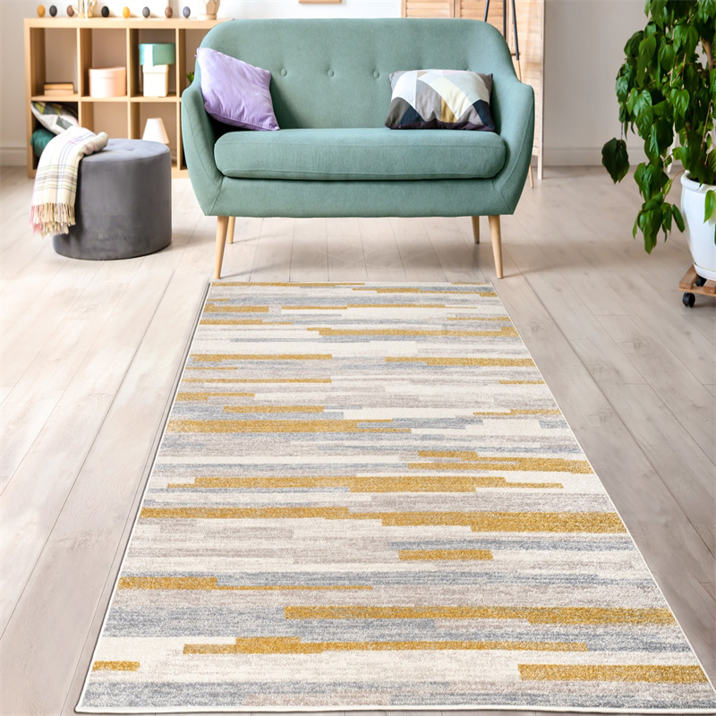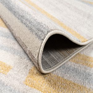: This rug is designed with a abstract pattern with neutral colors like mustard yellow, grey, and beige that features rustic minimalistic vibe with a distressed finish. This combination makes this rug simple and sophisticated.